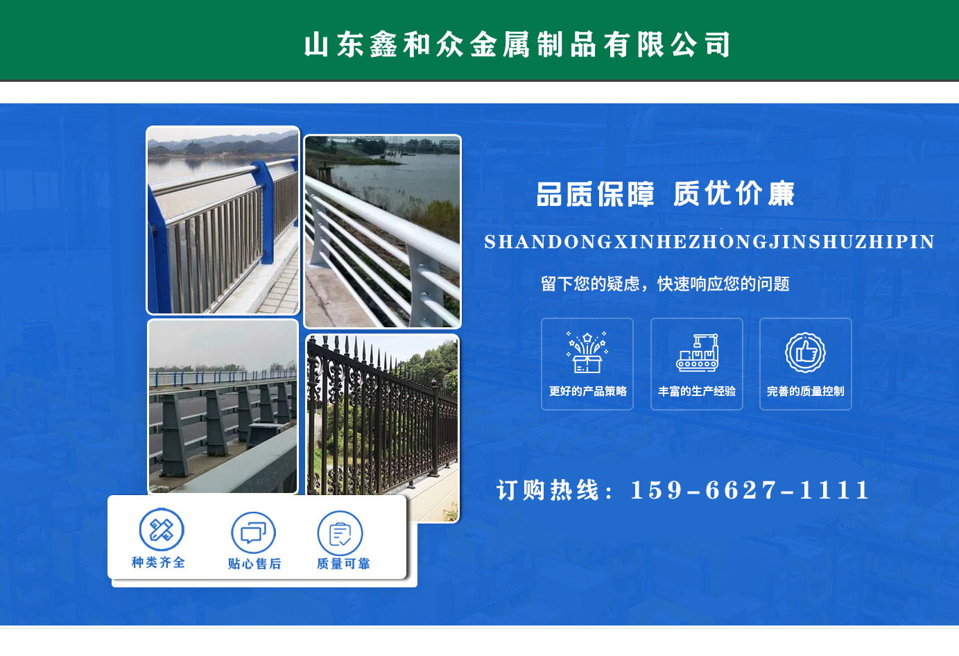 山東鑫和眾金屬制品有限公司主要產(chǎn)品有防撞護(hù)欄,橋梁護(hù)欄,道路護(hù)欄,河道護(hù)欄,不銹鋼護(hù)欄等護(hù)欄。提供設(shè)計(jì)方案,一站式定制,包您滿意價格優(yōu)惠,歡迎來電咨詢! 公司常年從事銷售護(hù)欄防撞護(hù)欄,橋梁護(hù)欄,道路護(hù)欄,河道護(hù)欄,不銹鋼護(hù)欄,橋梁鋼護(hù)欄,河道燈光護(hù)欄等。產(chǎn)品廣泛應(yīng)用于橋梁、河道、旅游景區(qū)、道路、公路、公園、小區(qū)、景觀、道路防撞等領(lǐng)域?! 」井a(chǎn)品均采用優(yōu)質(zhì)不銹鋼材料,符合相關(guān)標(biāo)準(zhǔn)。各種型號不銹鋼復(fù)合管及護(hù)欄,質(zhì)量嚴(yán)格把控。產(chǎn)品強(qiáng)度高、耐腐蝕、焊接牢固、抗沖擊、性能好,防撞護(hù)欄結(jié)構(gòu)簡單、美觀實(shí)用大方。 歡迎前來訂購!...